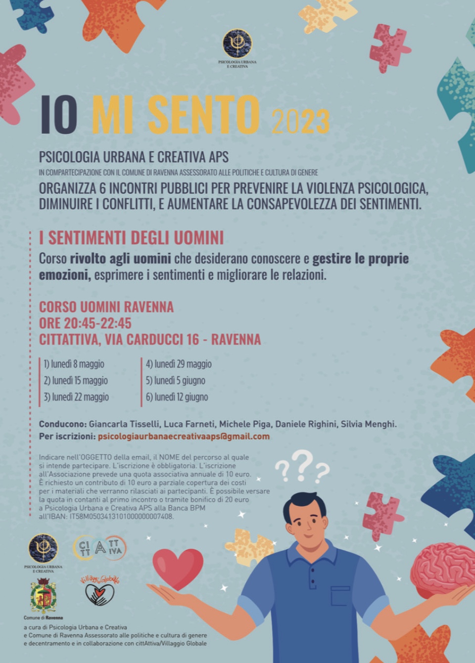 Psicologia Urbana e Creativa APS e Comune di Ravenna – Assessorato alle Politiche e Cultura di Genere e Decentramento avviano a un percorso dedicato agli uomini che desiderano migliorare le relazioni familiari e interpersonali attraverso una maggiore consapevolezza dei sentimenti e l’utilizzo della comunicazione empatica.