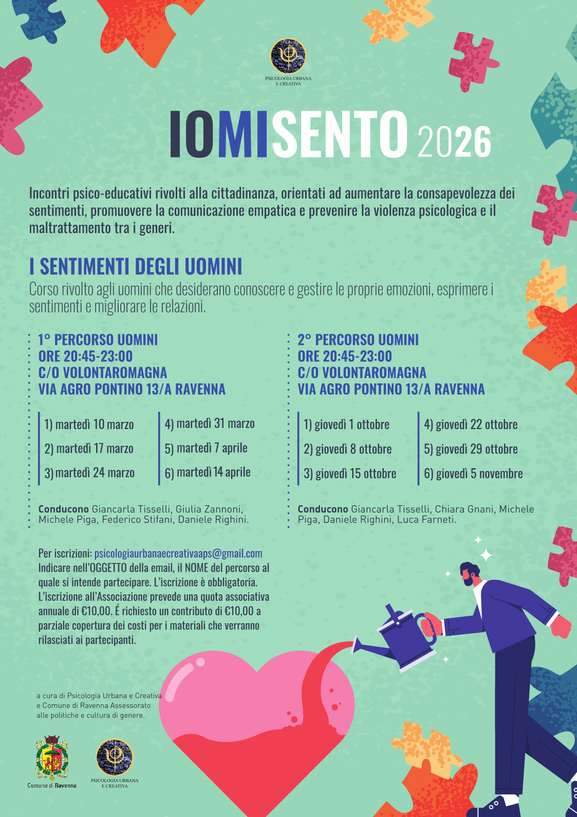 Psicologia Urbana e Creativa APS in collaborazione con il Comune di Ravenna – Assessorato alle Politiche e Cultura di Genere – avvia un percorso dedicato agli uomini che desiderano migliorare le relazioni familiari e interpersonali attraverso una maggiore consapevolezza dei sentimenti e l’utilizzo della comunicazione empatica.