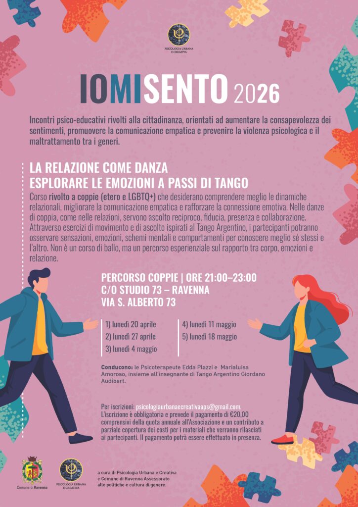 Il corso è parte del progetto “ IO MI SENTO”, realizzato da psicologia Urbana e Creativa APS in collaborazione col Comune di Ravenna – Assessorato alle Politiche di Genere, che comprende incontri psicoeducativi rivolti alla cittadinanza, orientati ad aumentare la consapevolezza dei sentimenti, promuovere la comunicazione empatica e prevenire la violenza psicologica e il maltrattamento tra i generi.